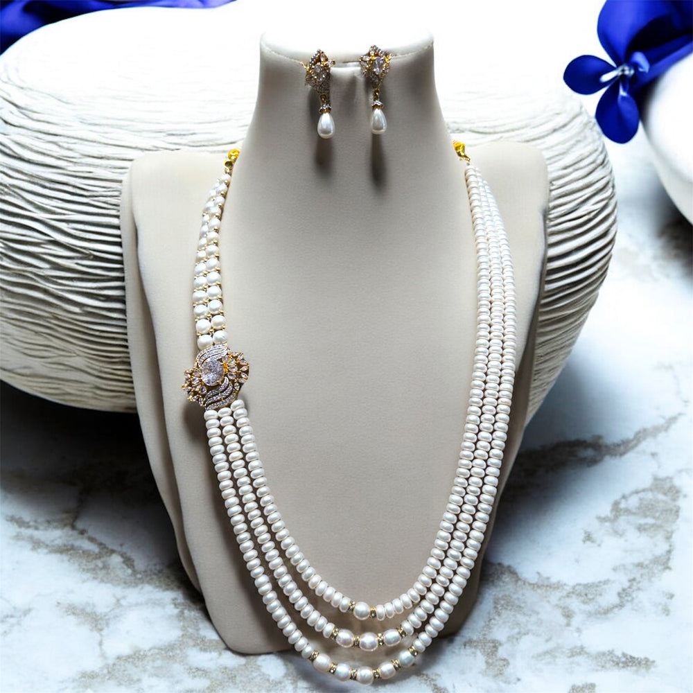 Elevate your jewelry collection with this Certified Three-Strand Natural Freshwater Pearl Set. A perfect blend of heritage and high-fashion, this set is designed for the modern connoisseur.Key FeaturesGenuine Pearls: Features natural freshwater pearls (5.5-6mm) boasting a rich, authentic luster.Artisanal Locket: A silver-mixed alloy base meticulously set with brilliant CZ stones and a deep onyx-colored centerpiece.Expert Finish: Three expertly tensioned strands ensure a graceful, tiered drape.Authentication: Accompanied by a formal bill and certification verifying pearl quality and origin.