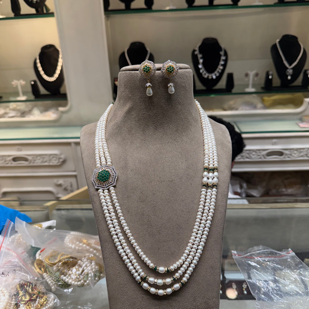 """Indulge in the luxury of nature’s finest pearls. This exquisitely crafted jewelry set combines the soft glow of Real Pearls with the brilliant sparkle of Cz-cut stones, making it an essential masterpiece for your festive and formal wardrobe. Pearl Size: 6mm Aprox Pearls Quality :AAA Necklace Length: 18 inchs Color Stone: GreenOnyx Strand Count: Three layers Occasion: Bridal, Party Wear proper Bill & Certification will be provided with product Shop only At Omkar Balaji Pearls"""