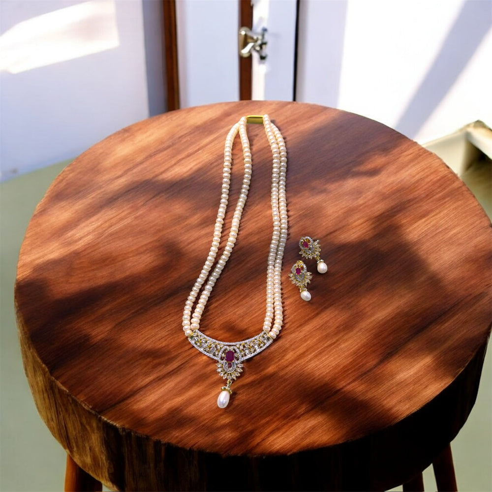 Indulge in the luxury of nature’s finest pearls. This exquisitely crafted jewelry set combines the soft glow of Real Pearls with the brilliant sparkle of Cz-cut stones, making it an essential masterpiece for your festive and formal wardrobe. Pearl Size: 5-5.5mm Aprox Pearls Quality :AAA Necklace Length: 16 inchs Color Stone: onyx color - RED Strand Count: 2 layers Occasion: Bridal, Party Wear proper Bill & Certification will be provided with product Shop only At Omkar Balaji Pearls