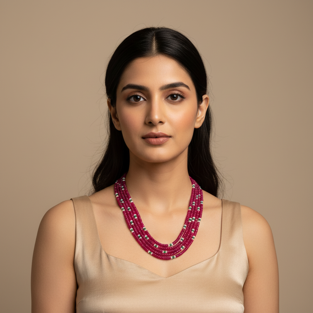 Stone Type: Real Natural Ruby,Pearls & Beryl Emerald / Stone Shape: Facted Beads Stone origin: AfricaStone size: 3.5-4 mm aprox Length: 16 Approx Metal; Alloy Earrings: onyx Stone